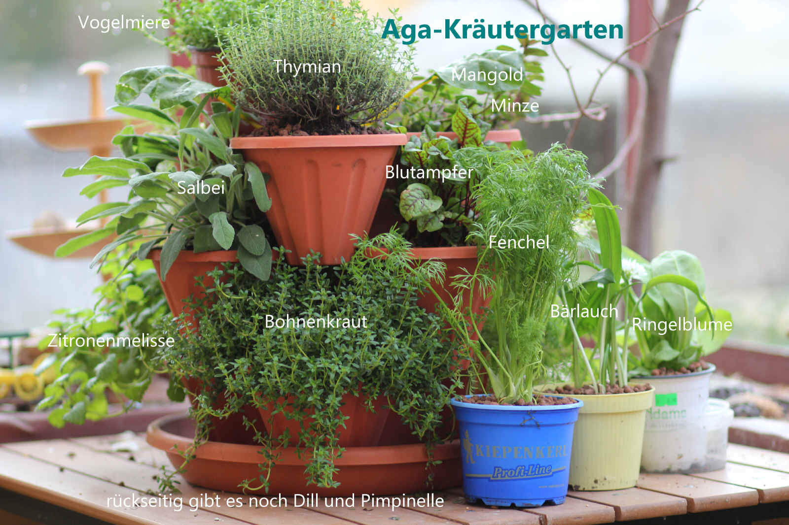 AgaKräuter, z.B. Bärlauch, Basilikum, Blutampfer, Bohnenkraut, Dill, Fenchel, Kamille, Kresse, Mangold, Minze, Petersilie, Pimpinelle, Ringelblume, Salbei, Schnittlauch, Thymian, Vogelknöterich, Vogelmiere, Zitronenmelisse und vieles mehr.