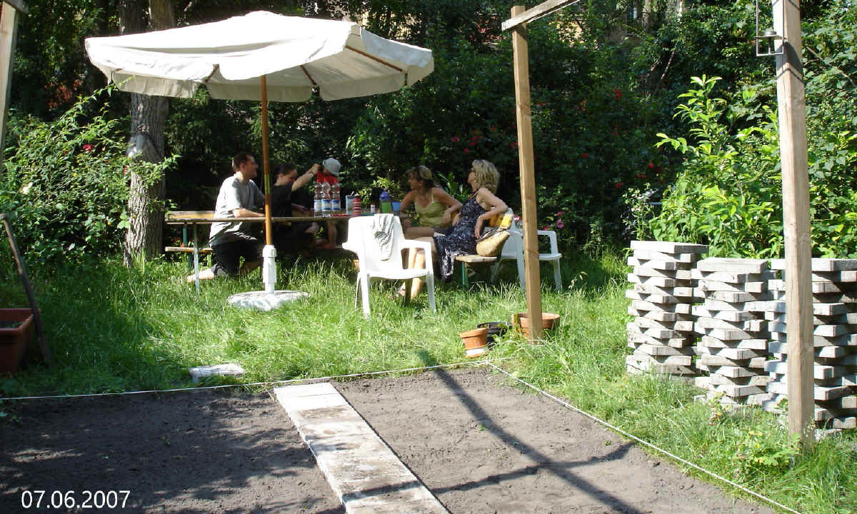 Grillplatzbefestigung2007Juni, vorher staubig, 5 cm tief harken, mit 30er Platten auslegen, in 2011 um eine Plattenreihe verbreitert. MaxiJournal Grillplatz