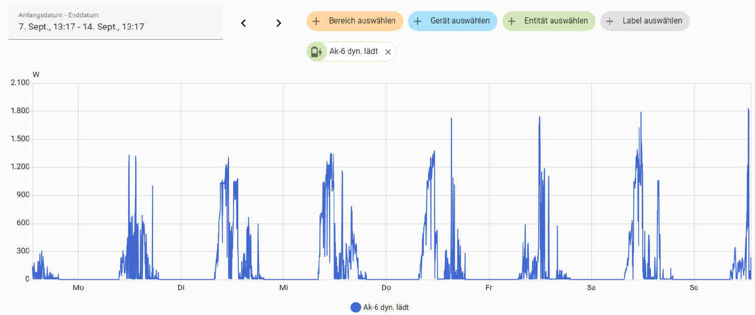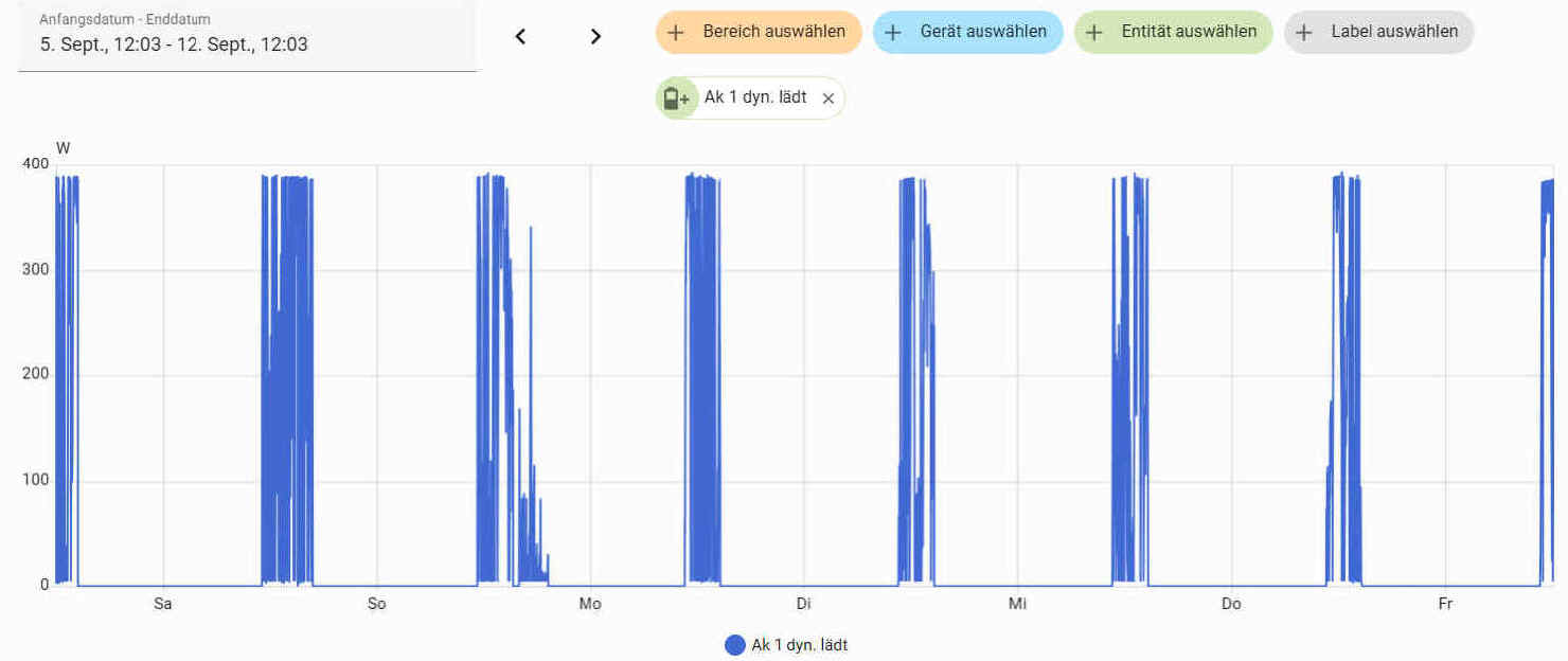 Und hier das Speicherprofil einer größeren PV mit Ladereglern, die ganztägig lastdynamisch